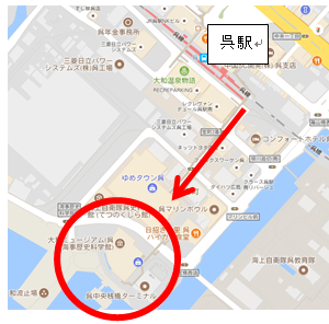 JR呉駅改札を出て、右側の連絡通路で徒歩5分